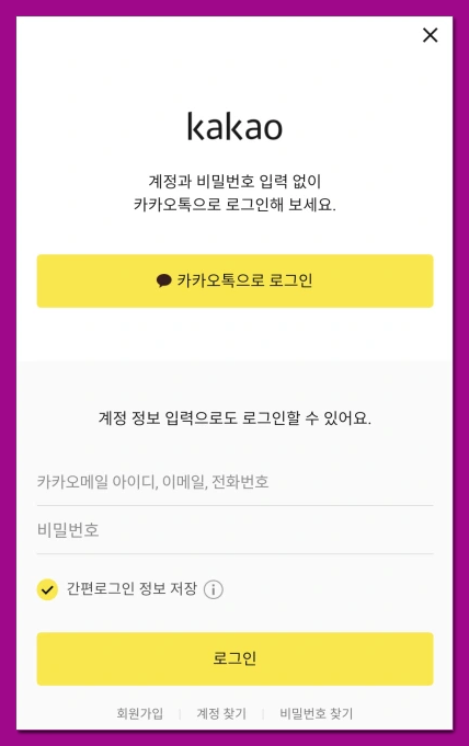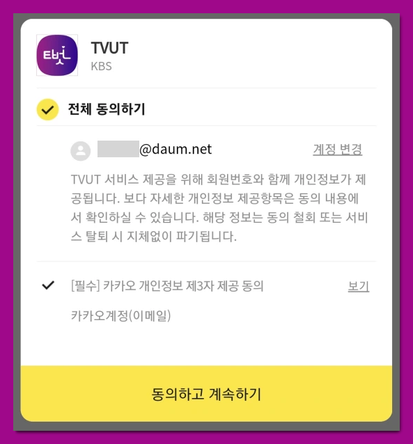 만일 카카오로 시작하기를 선택하셨다면 카카오 톡으로 로그인을 누르고 개인 약관에 전체 동의해 주시면 됩니다.