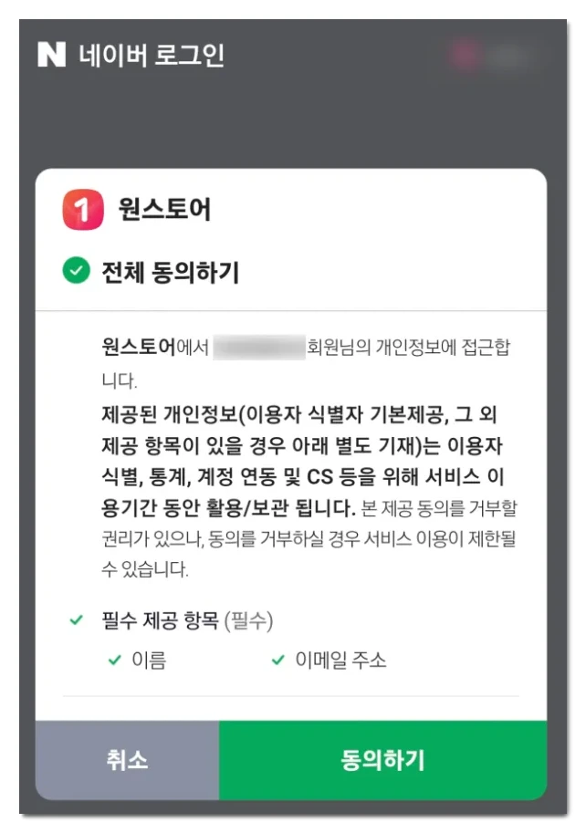 네이버 아이디로 가입한다면 네이버 로그인 창이 나오고 이름과 이메일 주소를 사용한다는 내용에 전체 [동의하기] 눌러주세요.